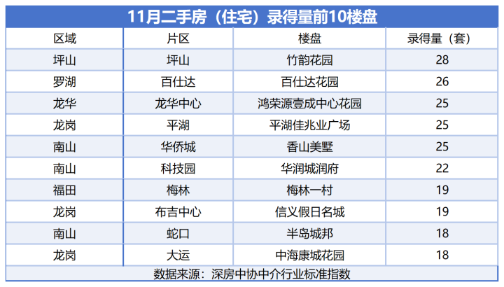 11月的热卖榜单里,刚需、改善、豪宅楼盘都有上榜,不过出现了两个让我意外的盘,一个是坪山的回迁房小区「竹韵花园」,直接冲到了榜首,卖了28套;另一个是龙岗的「中海康城」,3房总价不到300万,也杀进了前十。