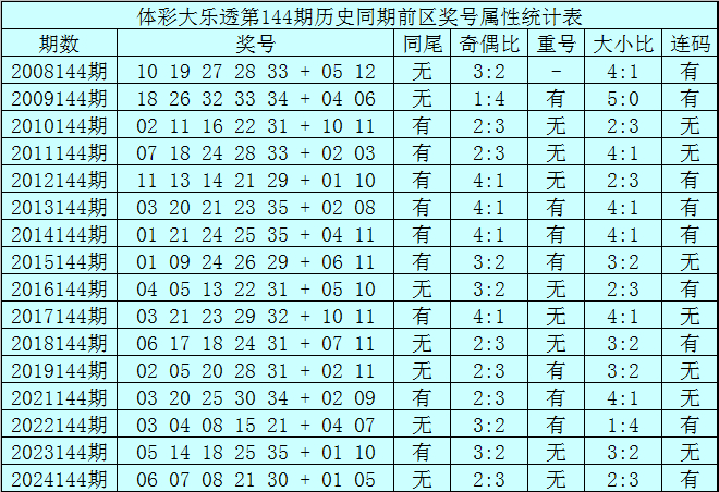 体彩大乐透第144期历史同期开出16次奖号,其统计详见下表: