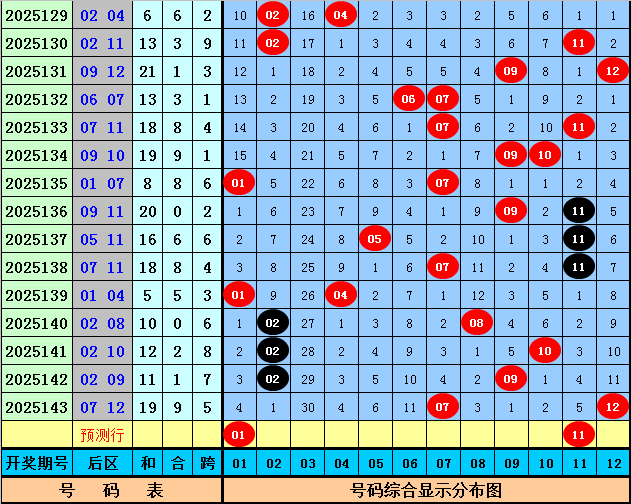 后区号码分析:在第144期历史同期开奖中奖,奖号11出现6次,奖号10出现5次,奖号02出现4次,奖号01 04 05出现3次,奖号06 07出现2次,奖号03 08 09 12出现1次。本期后区五码参考01、02、03、04、11。