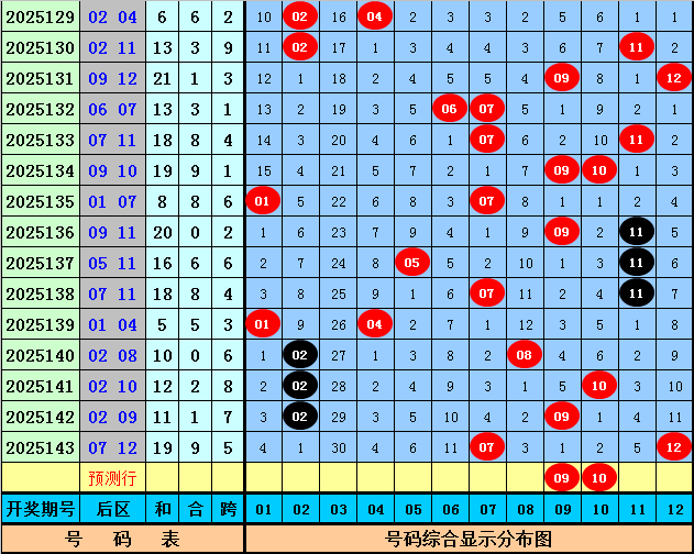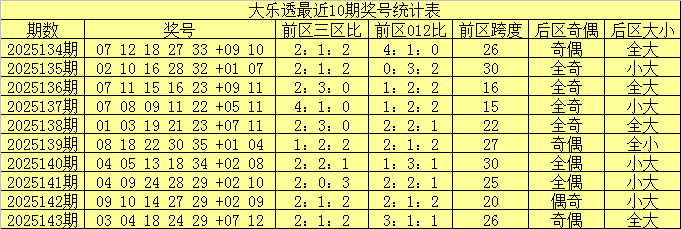 大乐透第2025143期奖号开出:03 04 18 24 29 +07 12。其中前区三区比为2:1:2,012路比为3:1:1,后区开出全大、一奇一偶奖号。